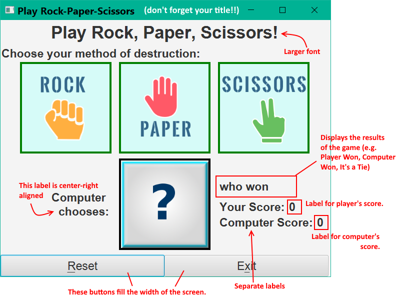 Your program should play Rock, Paper, Scissors between a human player and a computer player. If necessary, see how to play Rock, Paper, Scissors