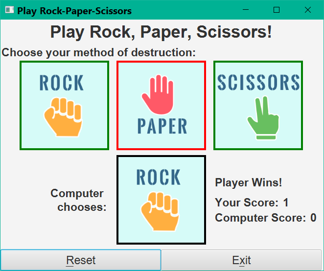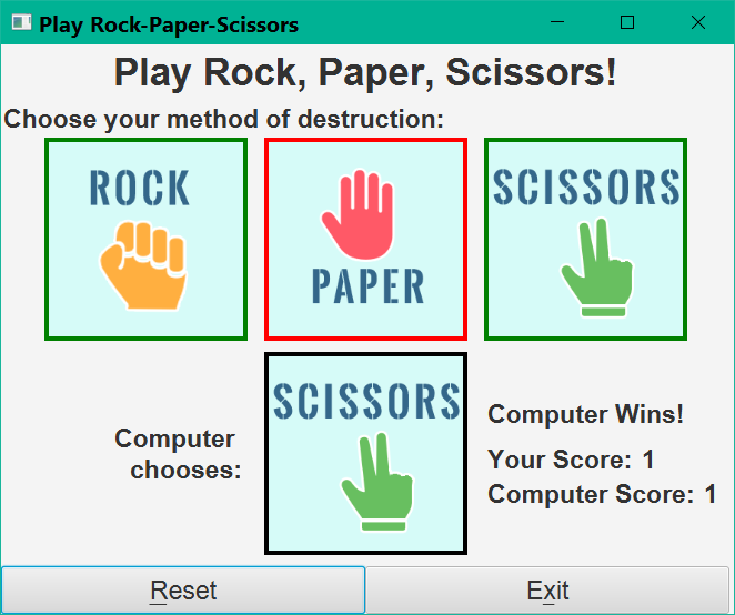 The reset button puts the screen back into its default state. This includes resetting borders, the computer's image, and the Player scores.